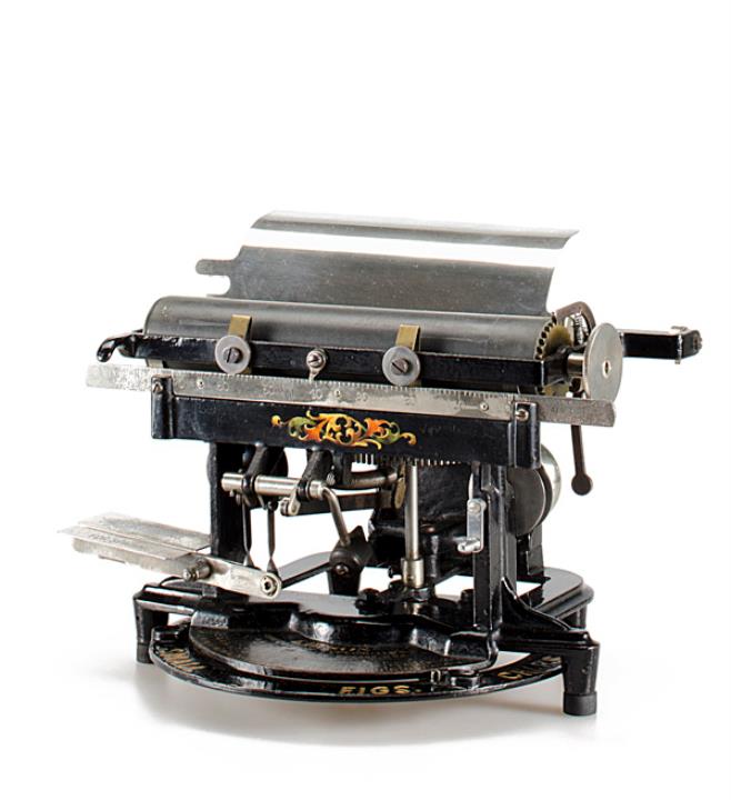Schreibmaschine Edison Mimeograph Typewriter Modell 1 Eigenschaften: Zeiger, Typenkranz (78 Zeichen), Groß-/Kleinbuchstaben, Unteranschlag, Farbband Konstrukteur: Albert Blake Dick Besonderheit: aufklappbarer Wagen, dekorative Bemalung, Seriennummer 1935