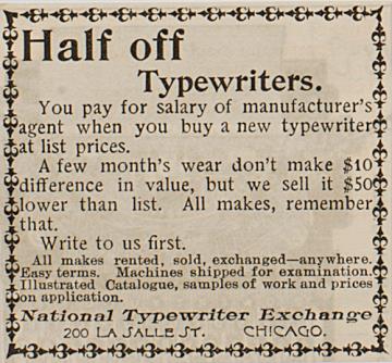 Werbeanzeige für Schreibmaschinenhandlung National Typewriter Exchange monochrom