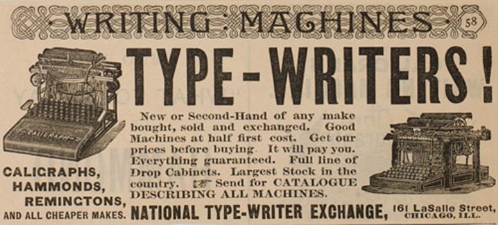 Werbeanzeige für Schreibmaschinenhandlung National Type-Writer Exchange monochrom