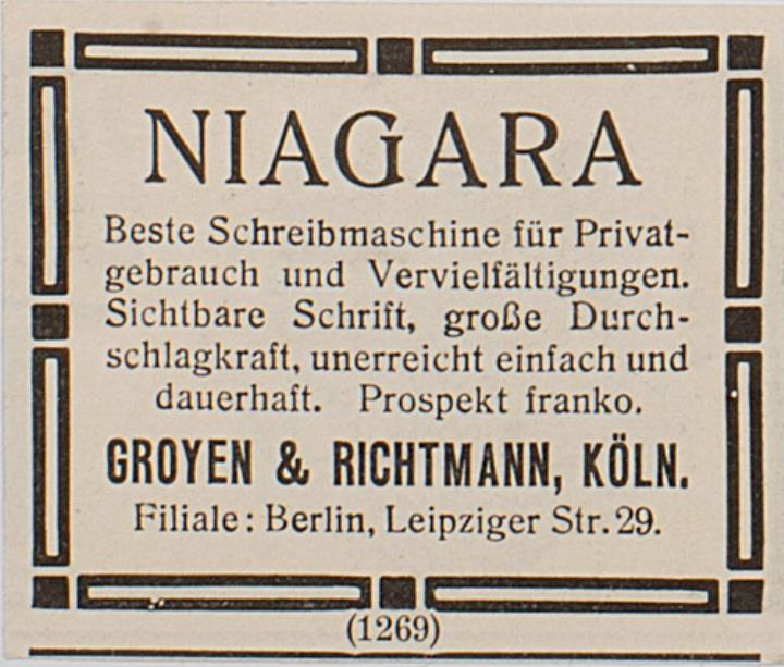 Werbeanzeige für Schreibmaschine Niagara monochrom