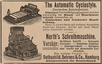 Werbeanzeige für Schreibmaschine North's und Vervielfältigungsapparat Cyclostyle monochrom