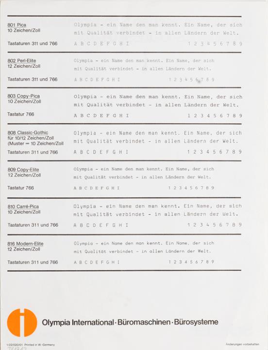 Schriftartenverzeichnis für Schreibmaschine Olympia ES100, ES101 Nr. 1/22/020/01