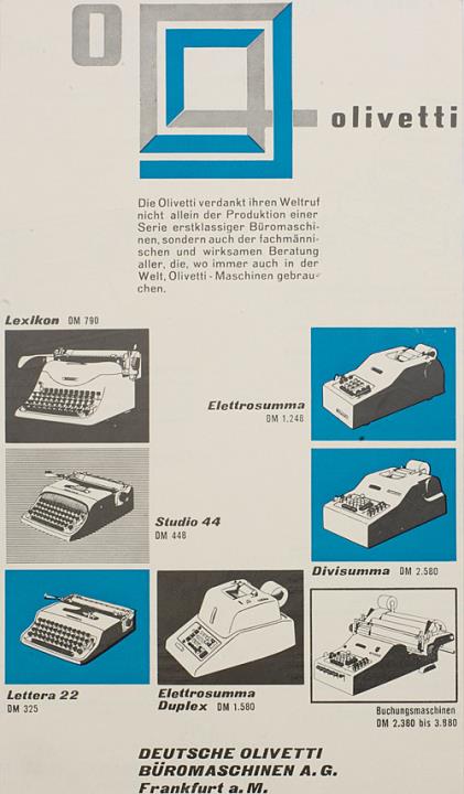 Werbeanzeige für Schreibmaschinen und Rechenmaschinen Olivetti polychrom