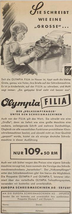 Werbeanzeige für Schreibmaschine Olympia Filia monochrom