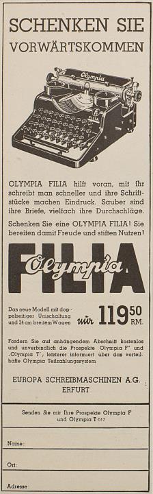 Werbeanzeige für Schreibmaschine Olympia Filia monochrom