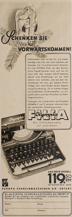 Werbeanzeige für Schreibmaschine Olympia Filia monochrom