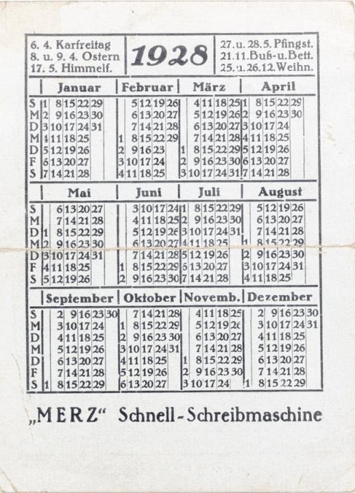 Taschenkalender Jahr 1928 mit Werbeaufdruck für Schreibmaschine Merz Text: Die deutsche Präzisions-Voll-Schreibmaschine aus Stahl!