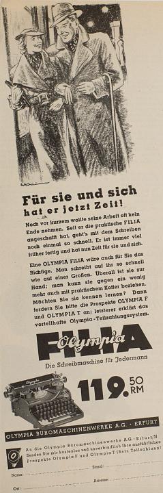 Werbeanzeige für Schreibmaschine Olympia Filia monochrom