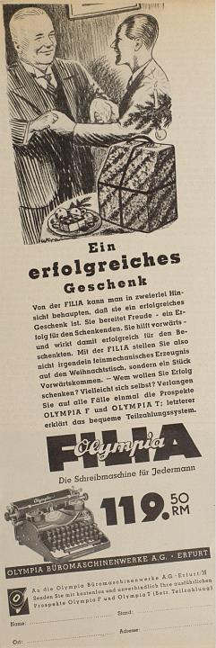 Werbeanzeige für Schreibmaschine Olympia Filia monochrom