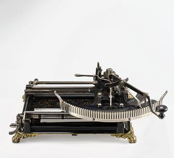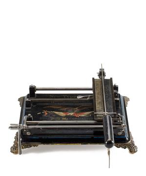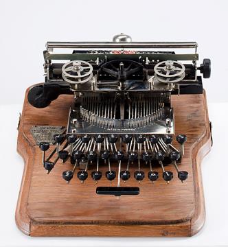 Schreibmaschine Keystone Modell 1; auf Unterboden der Holzabdeckung montiert Eigenschaften: Typensegment, Druckhammeranschlag, doppelte Umschaltung, Farbband Tastatur: universal, dreireihig, 28 Schreibtasten Konstrukteur: William P. Quentell Besonderheit: austauschbares Typensegment