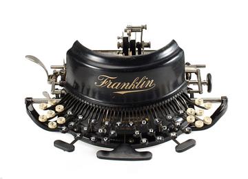 Schreibmaschine Franklin Modell 7 Eigenschaften: Typenhebel stehend, Oberanschlag, einfache Umschaltung, Farbband Tastatur: halbrund, universal, dreireihig, 40 Tasten Konstrukteur: Wellington Parker Kidder, Walter J. Barron Besonderheit: Zahnradverbindung der Tasten-und Typenhebel, achteckige Tasten, aufrecht positionierte Farbbandspulen; benannt nach Benjamin Franklin