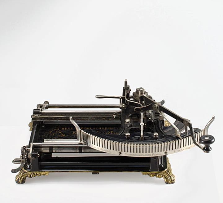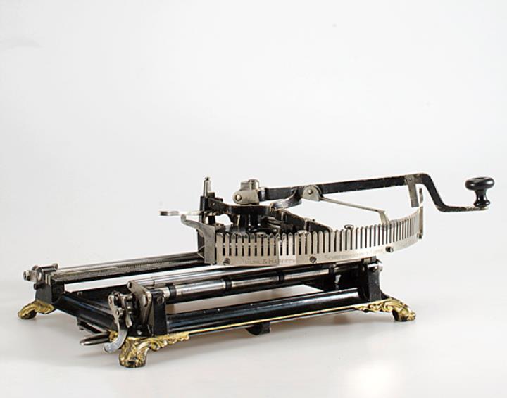 Schreibmaschine Kosmopolit Eigenschaften: Zeiger/Eintaster, austauschbare Typenplatte aus Kautschuk (90 Zeichen), Oberanschlag, Groß-/Kleinbuchstaben, Farbkissen Konstrukteur: Heinrich Guhl oder J. C. Koch Besonderheit: die Maschine wurde ursprünglich mit sechs Typenplatten geliefert