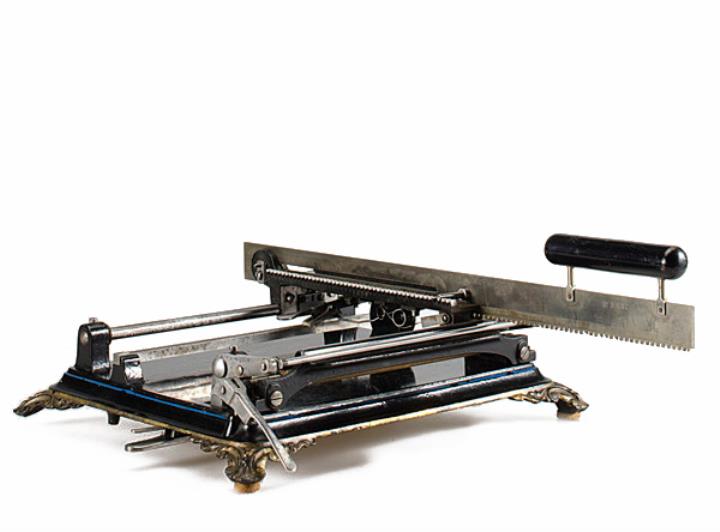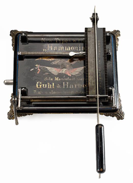 Schreibmaschine Hammonia Eigenschaften: Zeiger/Eintaster, sägeblattähnlicher Typenträger (45 Zeichen), Großbuchstaben, Oberanschlag, Kohlepapierband, aufklappbarer Standfuß Konstrukteur: Andreas Hansen Besonderheit: erste in Deutschland hergestellte Schreibmaschine, Seriennummer 319