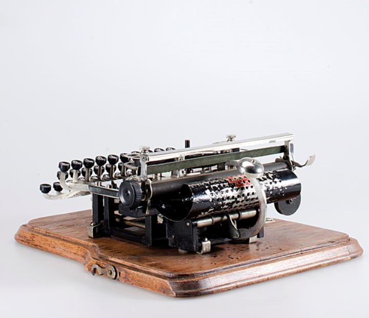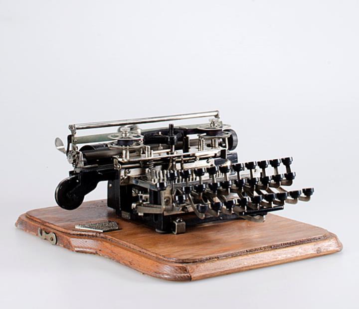 Schreibmaschine Keystone Modell 1; auf Unterboden der Holzabdeckung montiert Eigenschaften: Typensegment, Druckhammeranschlag, doppelte Umschaltung, Farbband Tastatur: universal, dreireihig, 28 Schreibtasten Konstrukteur: William P. Quentell Besonderheit: austauschbares Typensegment, Seriennummer 2261
