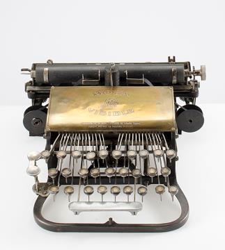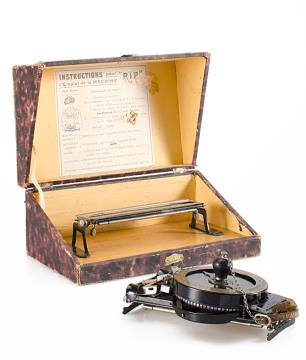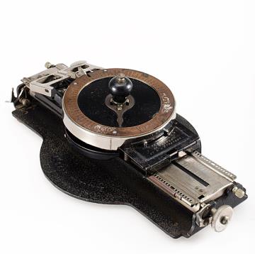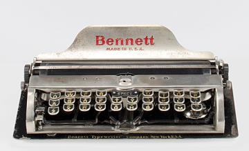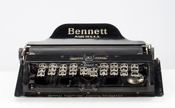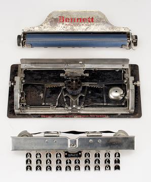Schreibmaschine Bennett (Farbe schwarz) Eigenschaften: Typenzylinder, Vorderanschlag, doppelte Umschaltung, Farbband, ausklappbares Papierblech Tastatur: universal, dreireihig, 28 Schreibtasten Konstrukteur: Charles Almon Bennett Besonderheit: kleinste bekannte Tastaturschreibmaschine