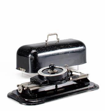 Schreibmaschine Virotyp; Tischmodell mit Metallabdeckung, schwarz Eigenschaften: Zeiger, Typenscheibe (92 Zeichen), Oberanschlag, Groß-/Kleinbuchstaben, Farbröllchen Konstrukteur: Henry Viry