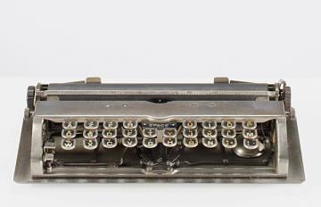 Schreibmaschine Bennett (vernickelt), in Hauptteile zerlegt Eigenschaften: Typenzylinder, Vorderanschlag, doppelte Umschaltung, Farbband, ausklappbares Papierblech Tastatur: universal, dreireihig, 28 Schreibtasten Papierblech mit rückseitiger Aufschrift: Casa Antonio Pisani, Cangallo 722 Buenos Aires, Unico Agente Konstrukteur: Charles Almon Bennett Besonderheit: kleinste bekannte Tastaturschreibmaschine