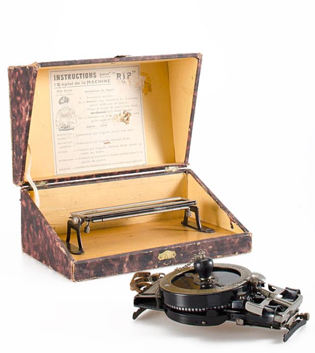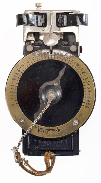 Schreibmaschine Virotyp; Reisemodell mit Pappschachtel Eigenschaften: Typenscheibe, Oberanschlag, Groß-/Kleinbuchstaben, Farbröllchen Konstrukteur: Henri Viry Besonderheit: das Modell konnte in der Bewegung (etwa zu Pferd) bedient werden. Der kleine Finger wurde in die Lederschlaufe gelegt, der Zeigerhebel mit Daumen und Zeigefinger gedreht. Mit der anderen Hand wurde die Maschine festgehalten und der Druckknopf betätigt, Seriennummer 8767