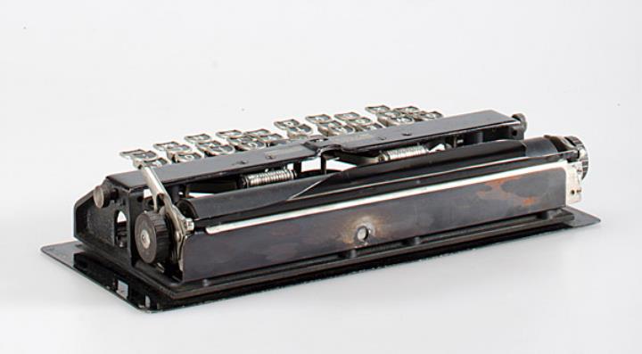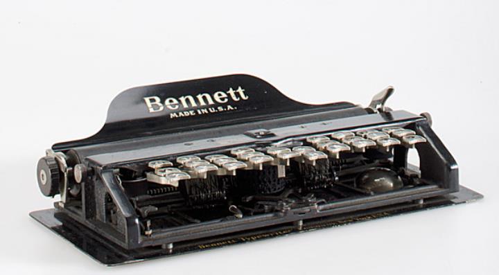 Schreibmaschine Bennett (Farbe schwarz) Eigenschaften: Typenzylinder, Vorderanschlag, doppelte Umschaltung, Farbband, ausklappbares Papierblech Tastatur: universal, dreireihig, 28 Schreibtasten Konstrukteur: Charles Almon Bennett Besonderheit: kleinste bekannte Tastaturschreibmaschine, Seriennummer 23664