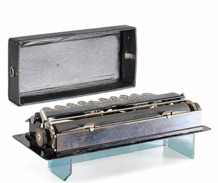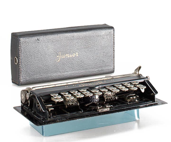 Schreibmaschine Junior Modell 2 mit Abdeckung aus Pappe Eigenschaften: Typenzylinder, Vorderanschlag, doppelte Umschaltung, Farbröllchen Tastatur: universal (AZERTY), dreireihig, 28 Schreibtasten Konstrukteur: Charles Almon Bennett Besonderheit: kleinste bekannte Tastaturschreibmaschine, Seriennummer 6671