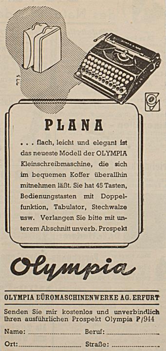 Werbeanzeige für Schreibmaschine Olympia Plana monochrom