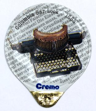 Kaffeerahmdeckel aus einer Serie (Cremo); rund mit Lasche, polychrom Motiv: Schreibmaschine Columbia Bar-Lock
