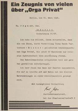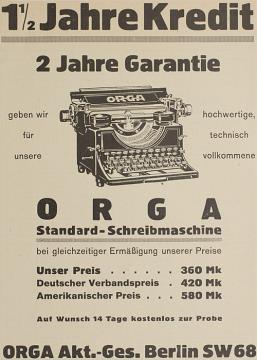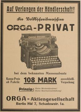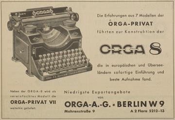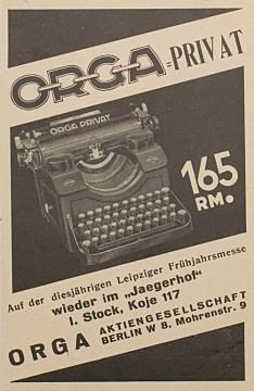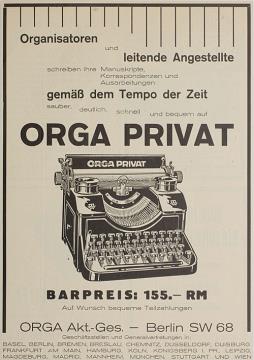 Werbeanzeige für Schreibmaschine Orga monochrom