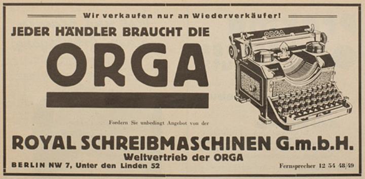 Werbeanzeige für Schreibmaschine Orga monochrom