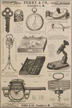 Werbeanzeige für Produkte des Versandhauses Perry & Co. (u. a. Schreibmaschine The Pocket Typewriter) monochrom