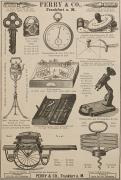 Werbeanzeige für Produkte des Versandhauses Perry & Co. (u. a. Schreibmaschine The Pocket Typewriter) monochrom