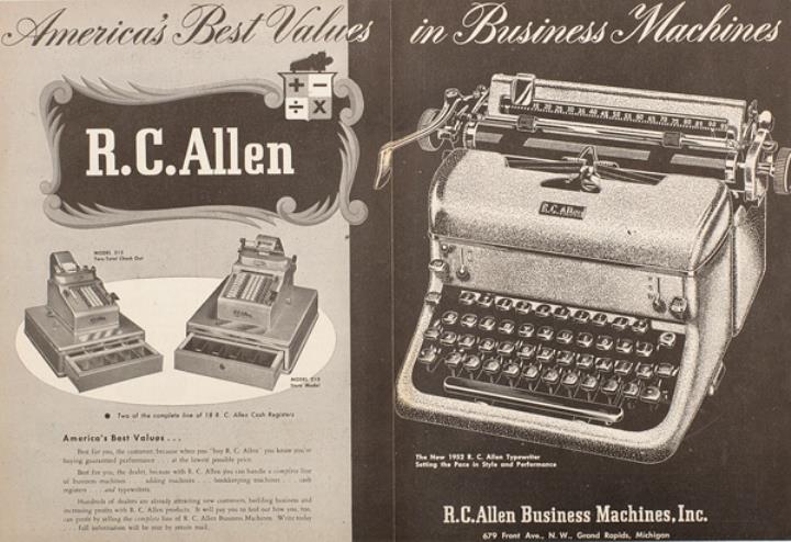 zweiseitige Werbeanzeige für Büromaschinen R.C. Allen monochrom