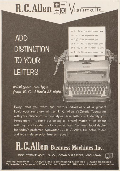Werbeanzeige für Schreibmaschine R.C. Allen VisOmatic monochrom