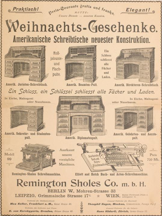 Werbeanzeige für Schreibtische und Schreibmaschine Remington Sholes monochrom