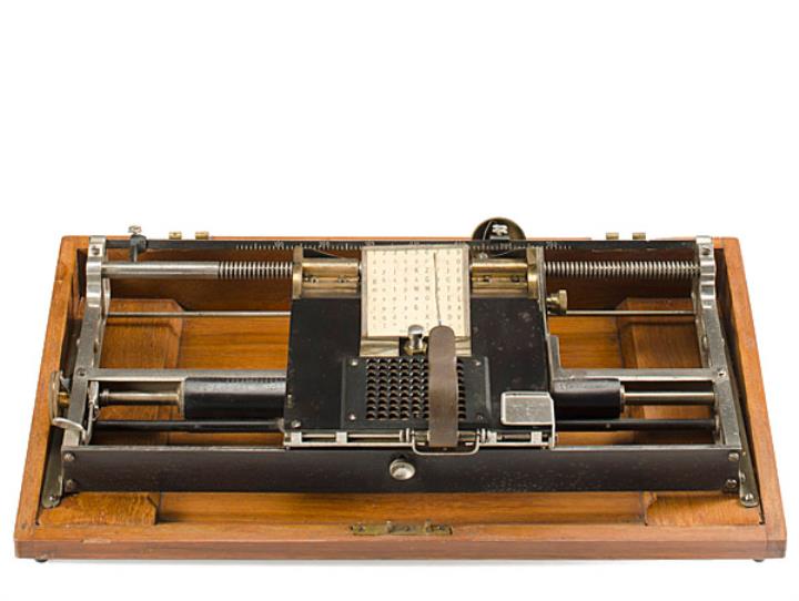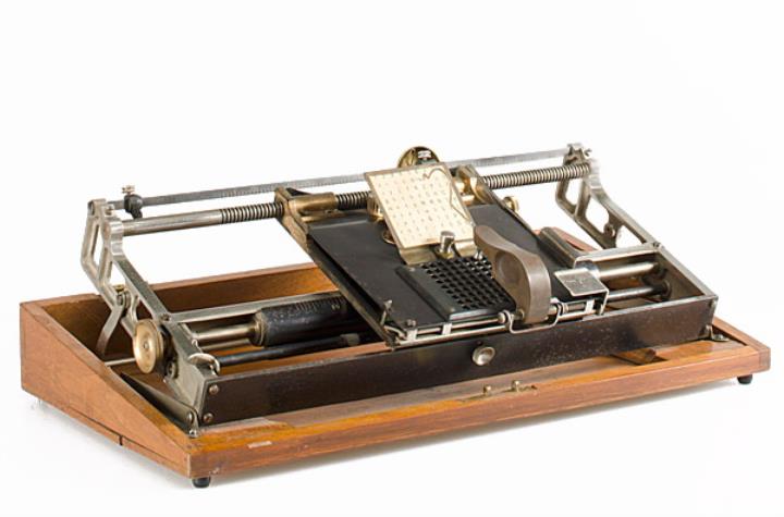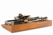 Schreibmaschine Hall Modell 2 Salem; mit Unterboden des Holzkoffers Eigenschaften: Zeiger/Eintaster, austauschbare Typenplatte aus Gummi (81 Zeichen), Oberanschlag, Farbkissen Konstrukteur: Thomas Hall Besonderheit: erste Schreibmaschine mit Sperrschrift; mit Indexkarte für eine schnellere Zeichenwahl, Seriennummer 5787