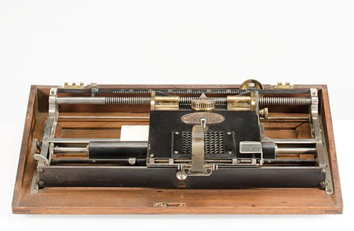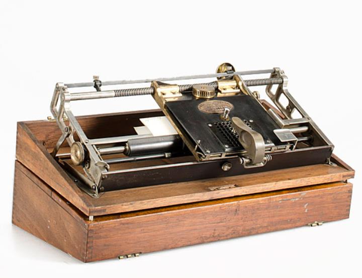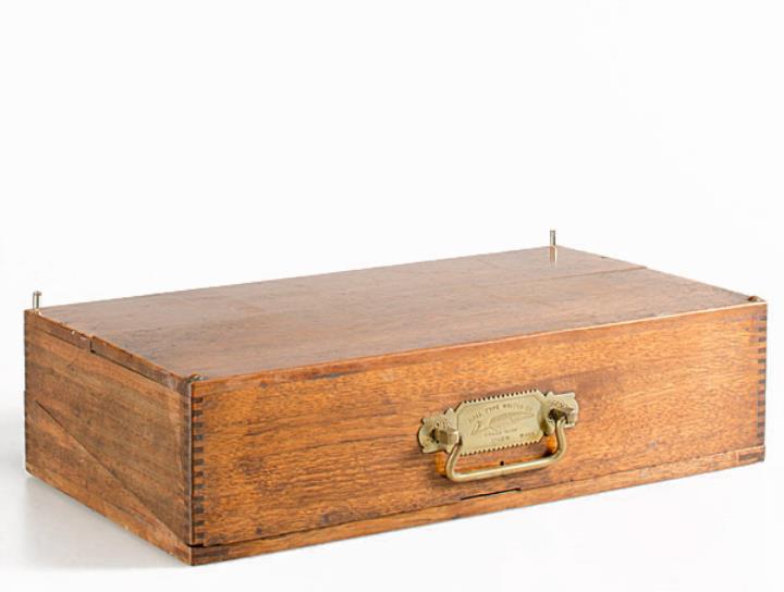 Schreibmaschine Hall Modell 2 Salem; mit Holzkoffer Eigenschaften: Zeiger/Eintaster, austauschbare Typenplatte aus Gummi (nicht vorhanden), Zeichenfeld, Oberanschlag, Farbkissen Konstrukteur: Thomas Hall Besonderheit: erste Schreibmaschine mit Sperrschrift, Seriennummer 8022