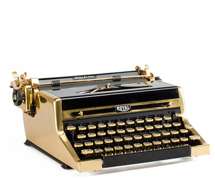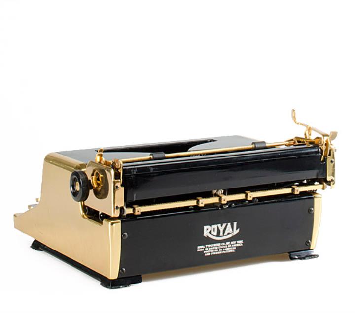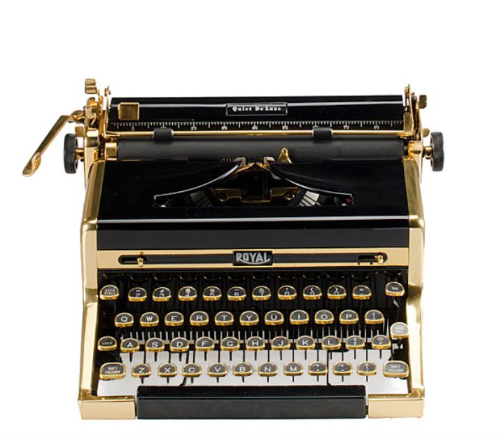 Schreibmaschine Royal Quiet de Luxe Sonderedition vergoldet Eigenschaften: Typenhebel, Vorderanschlag, einfache Umschaltung, Farbband Tastatur: universal, vierreihig, 42 Schreibtasten Konstrukteur: Henry Dreyfuss Besonderheit: Autor Ian Flemming besaß eine Royal QDL Gold, Seriennummer 1903719