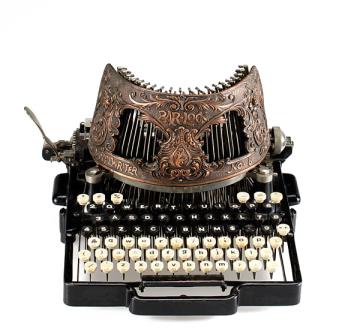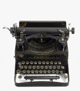 Schreibmaschine Bar-Lock Modell 6 Eigenschaften: Typenhebel stehend, Oberanschlag, Volltastatur, Farbband Tastatur: universal, sechsreihig, 78 Schreibtasten Konstrukteur: Charles Spiro Besonderheit: Hebelschloss (bar lock) für eine gerade Typenführung; dekorative Verkleidung in Kupfer