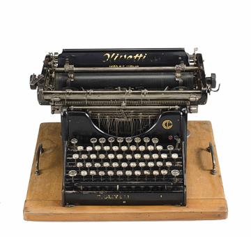 Schreibmaschine Olivetti M 1; auf Unterboden der Holzabdeckung montiert Eigenschaften: Typenhebel, Vorderanschlag, einfache Umschaltung, Farbband, Tabulator Tastatur: universal (italienisch), vierreihig, 42 Schreibtasten, zusätzliche Tastenreihe für Dezimaltabulator Konstrukteur: Camillo Olivetti Besonderheit: erste kommerziell gefertigte Schreibmaschine in Italien