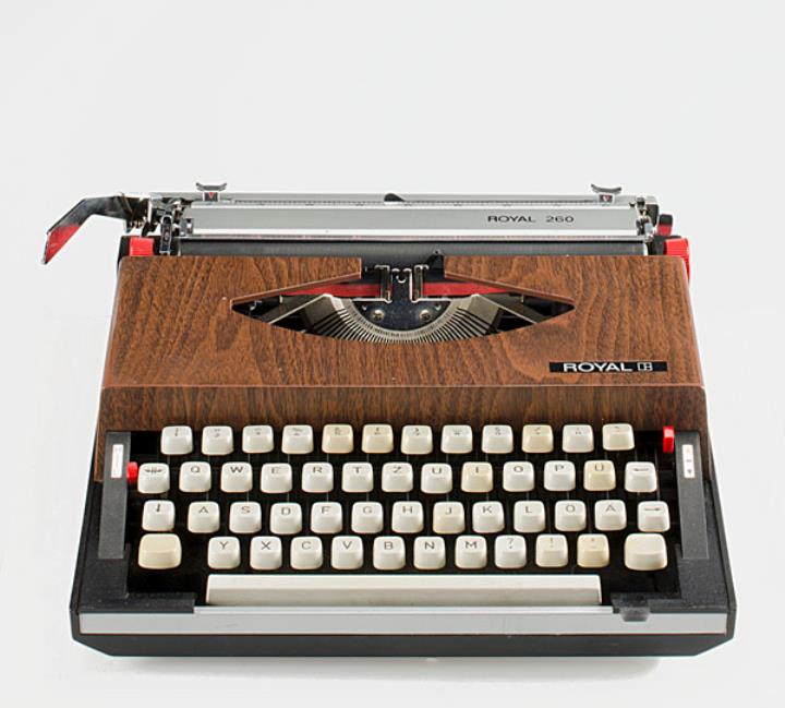 Schreibmaschine Royal 260 mit in der Abdeckung integriertem Transistorradio Eigenschaften: Typenhebel, Vorderanschlag, einfache Umschaltung, Farbband Tastatur: universal, vierreihig, 48 Schreibtasten, Seriennummer 1318320