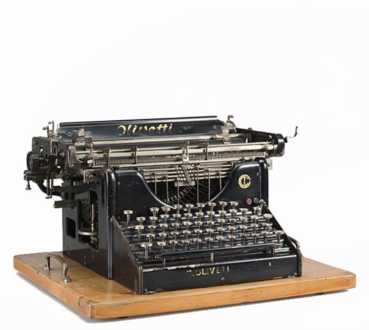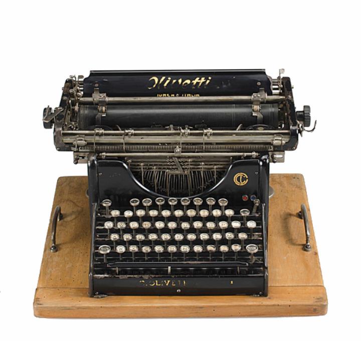 Schreibmaschine Olivetti M 1; auf Unterboden der Holzabdeckung montiert Eigenschaften: Typenhebel, Vorderanschlag, einfache Umschaltung, Farbband, Tabulator Tastatur: universal (italienisch), vierreihig, 42 Schreibtasten, zusätzliche Tastenreihe für Dezimaltabulator Konstrukteur: Camillo Olivetti Besonderheit: erste kommerziell gefertigte Schreibmaschine in Italien, Seriennummer 163226