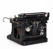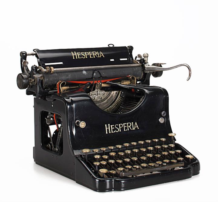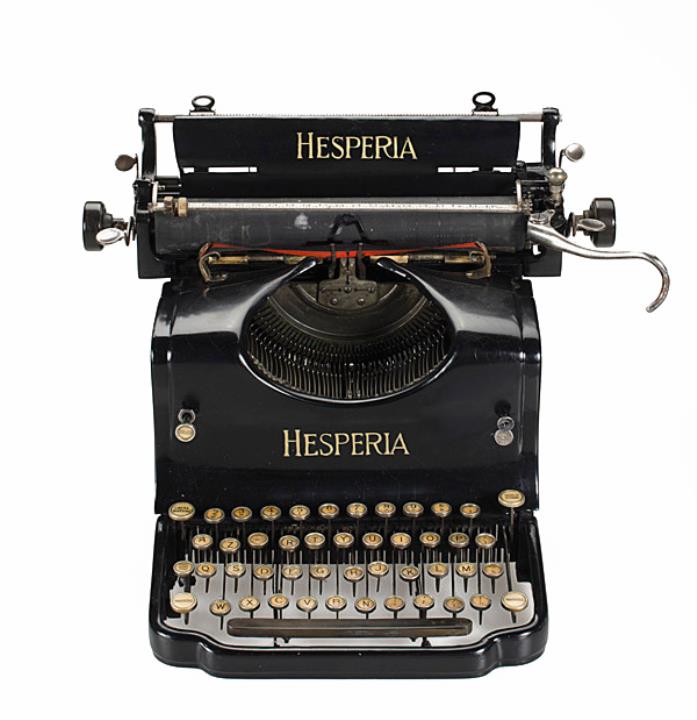 Schreibmaschine Hesperia Typenhebel, Vorderanschlag, einfache Umschaltung, Farbband Tastatur: universal (AZERTY), vierreihig, 42 Schreibtasten Konstrukteur: Alberto Levi andere Bezeichnung: Fortuna, Seriennummer 703