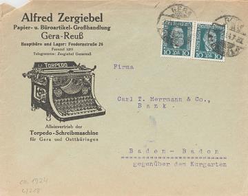 Briefumschlag mit Firmendruck der Bürowarenhandlung Alfred Zergiebel, Gera adressiert (Maschinenschrift) an Firma Carl Herrmann & Co., Baden-Baden; zwei Briefmarken Deutsches Reich 10 RPf.; Poststempel Gera
