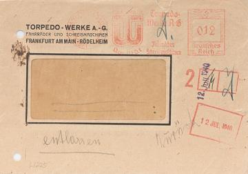 Briefumschlag mit Firmendruck und Absenderfreistempel der Torpedo Werke A.G. Stempel: Frankfurt/04.07.1940, Werbung Torpedo, Wert Deutsches Reich 12 RPf.