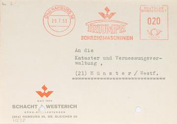 Vorderseite eines Briefumschlags mit Firmendruck und Absenderfreistempel der Bürowarenhandlung Schacht & Westerich adressiert (Maschinenschrift) an die Kataster und Vermessungsverwaltung Münster Stempel: Hamburg/29.07.1953, Werbung Triumph Schreibmaschinen, Wert Deutsche Bundespost 20 Pf.