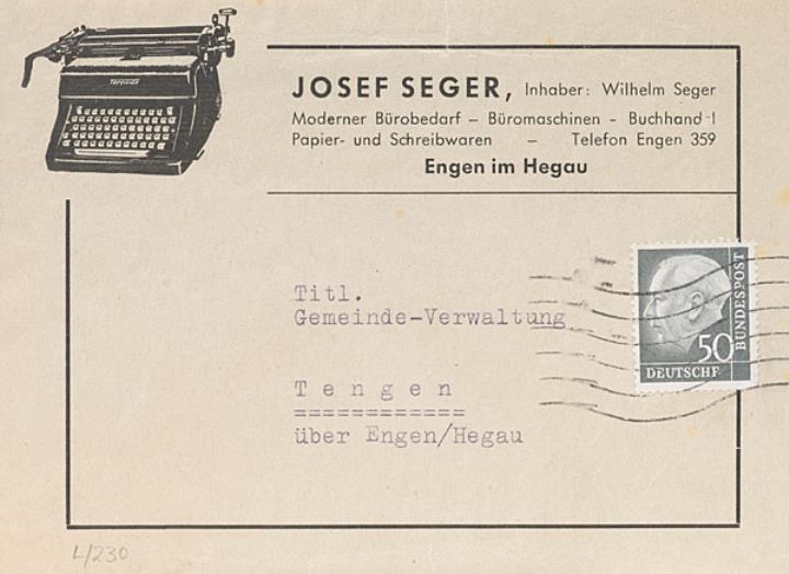 Vorderseite eines Briefumschlags mit Firmendruck der Bürowarenhandlung Josef Seger, Engen im Hegau adressiert (Maschinenschrift) an Gemeinde-Verwaltung Tengen; Briefmarke Deutsche Bundespost 50 Pf.