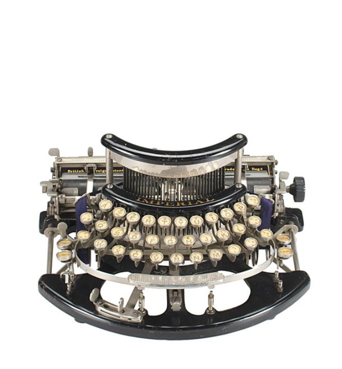 Schreibmaschine Imperial Modell B Eigenschaften: Typenhebel stehend, Oberanschlag, doppelte Umschaltung, Farbband Tastatur: halbrund, universal (AZERTY), dreireihig, 33 Schreibtasten Konstrukteur: Hidalgo Moya Besonderheit: austauschbarer Typensatz andere Bezeichnung: Typo, Lloyd, Seriennummer 14542