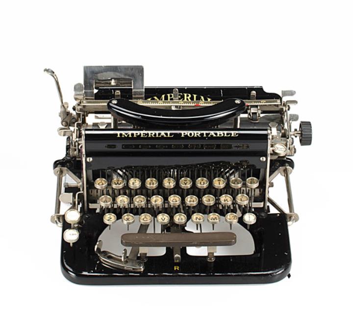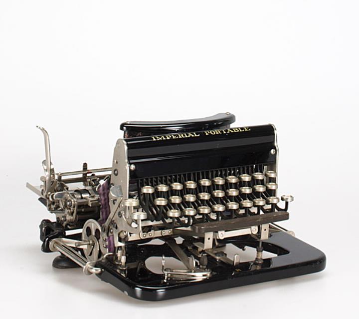 Schreibmaschine Imperial Portable Modell D (schwarz) Eigenschaften: Typenhebel stehend, Oberanschlag, doppelte Umschaltung, Farbband Tastatur: universal, dreireihig, 28 Schreibtasten Konstrukteur: Hidalgo Moya Besonderheit: austauschbarer Typensatz, Seriennummer 64306