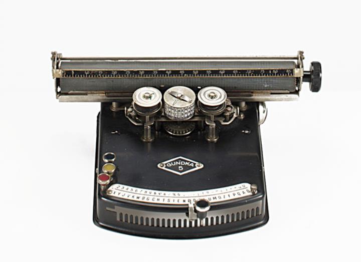 Schreibmaschine Gundka Modell 5 Eigenschaften: Zeiger/Eintaster, Typenzylinder, Vorderanschlag, einfache Umschaltung, Farbband Konstrukteur: Paul Muchajer Besonderheit: austauschbarer Typenträger andere Bezeichnung: Frolio, Perlita, G&K, M-W, Scripta, Write Easy, Gefro, Seriennummer 56651