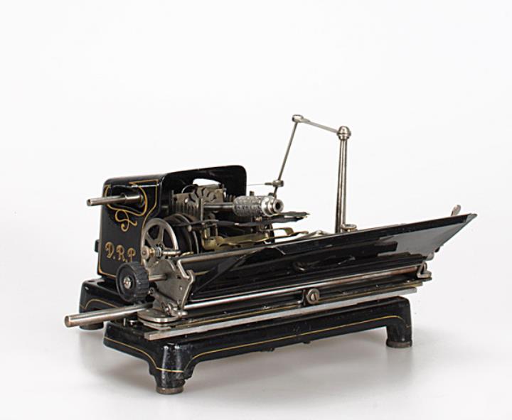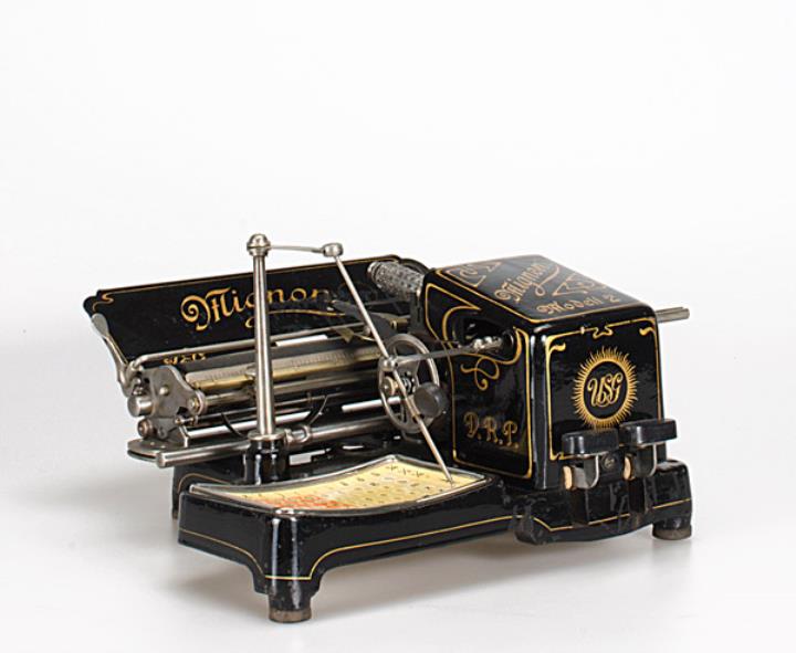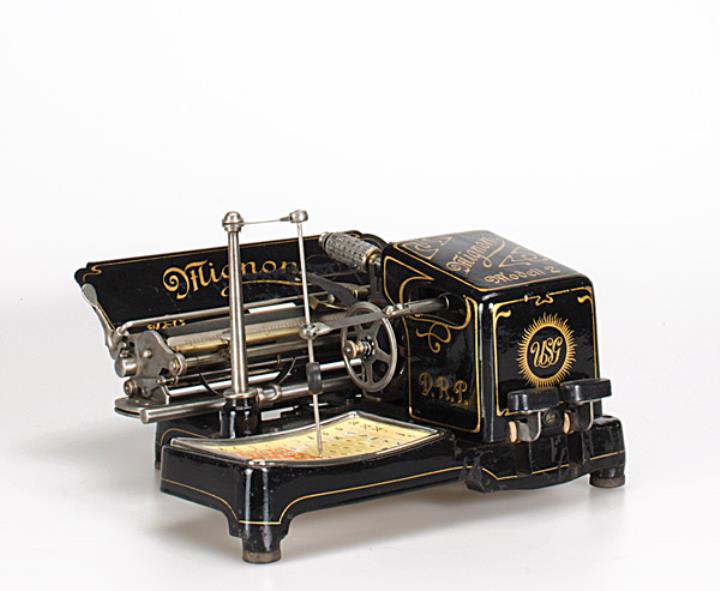 Schreibmaschine Mignon Modell 2 (schwarz) Eigenschaften: Zeiger, Typenzylinder, Oberanschlag, Farbband, Zeichenfeld Konstrukteur: Friedrich von Hefner-Alteneck Besonderheit: austauschbarer Typenträger, Seriennummer 24767