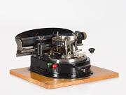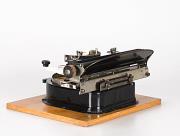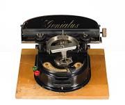 Schreibmaschine Geniatus; auf Holzbasis montiert Eigenschaft: Zeiger/Eintaster, Segment mit Typenband aus Gummi (90 Zeichen), Vorderanschlag, doppelte Umschaltung, Farbband, Seriennummer 12155